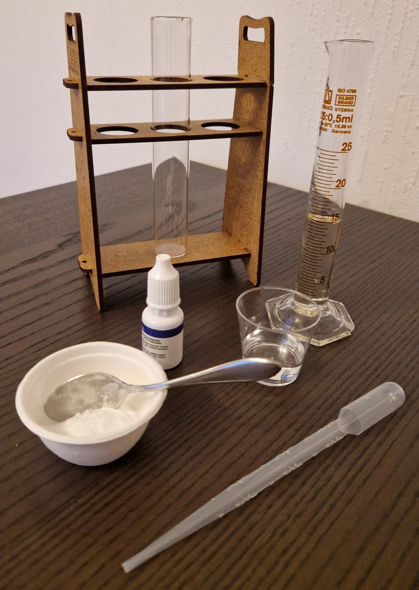 - Ajoute une fine couche de bicarbonate de soude au fond de l’éprouvette, du verre ou du bocal.