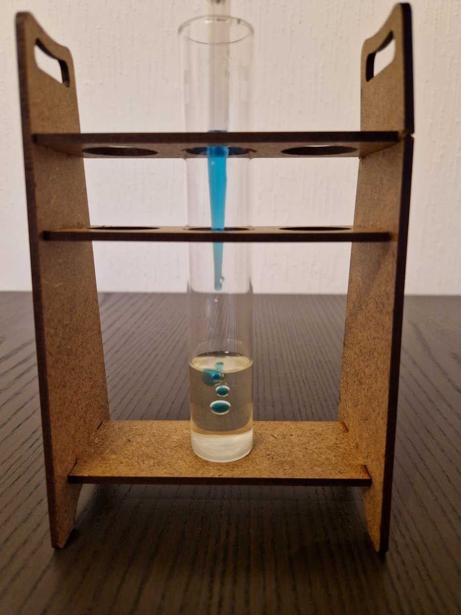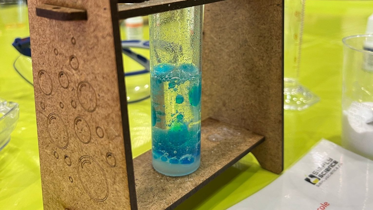 Les gouttes de vinaigre coloré ne se mélangent pas à l’huile, elles restent sous forme de bulles colorées. Elles descendent doucement vers le fond du récipient en verre. Lorsqu’elles touchent la couche de bicarbonate, de petites bulles commencent à se former. Ces petites bulles sont transparentes et montent rapidement vers la surface. Au bout d’un moment, les gouttes de vinaigre coloré remontent à la surface, puis redescendent, et ainsi de suite.