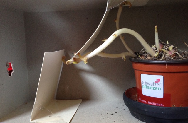 Les plantes ont besoin de lumière pour pousser. Grâce à la lumière, elles fabriquent du sucre en utilisant de l’eau et du gaz carbonique (CO2) présent dans l’air. Ce processus chimique appelé photosynthèse libère de l’oxygène (O2) dans l’air. Le sucre est nécessaire aux plantes pour pousser, l’oxygène pour respirer, tout comme nous. Sans lumière, la vie n’est pas possible pour les plantes, c’est pourquoi les germes tentent d’atteindre la source de lumière. Les germes, qui ne font pas encore de photosynthèse, se nourrissent du sucre qui est stocké dans la pomme de terre. Par contre le futur plant de pomme de terre dépend de la photosynthèse. Dans notre expérience, nous avons bloqué le chemin de la lumière avec de petits obstacles. Les germes ont dû se faufiler autour des obstacles pour atteindre la lumière. De cette façon, tu peux contrôler par où les germes doivent pousser. Tu peux aussi tester d’autres parcours et observer comment les germes contournent tes nouveaux obstacles.