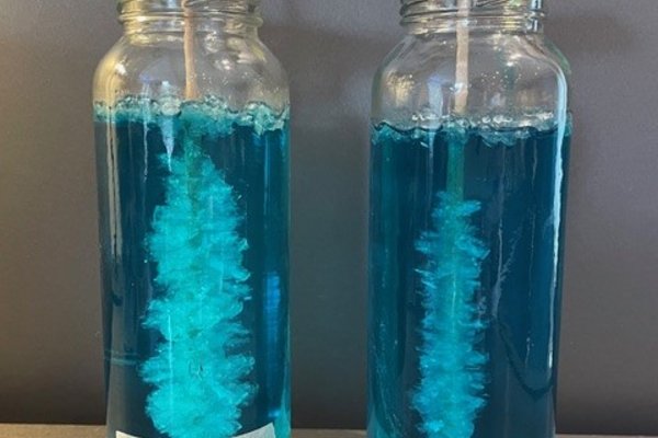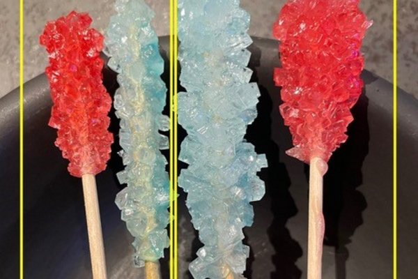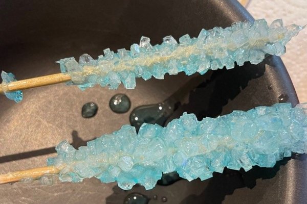 Da die Zuckerkristalle auch an der Glaswand oder am Boden wachsen können, wälzen wir das Holzstäbchen in Zucker, bevor wir es in die Lösung geben. Die in der Lösung herumschwimmenden Zuckerteilchen bleiben dann eher an den Zuckerkörnern am Stäbchen kleben als an der Glaswand. Das ist auch der Grund, warum wir den Sirup und das Holzstäbchen in ein frisches Glas überführen. Wir wollen nicht, dass die Kristalle an den „falschen“ Stellen wachsen!