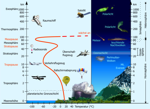 Der Aufbau der Atmosphäre von der Erdoberfläche bis zum Übergang ins Weltall; die rote Linie zeigt an, welche Temperatur in den unterschiedlichen Schichten herrscht. Bild: mit freundlicher Genehmigung von Dr. Michael Wössner, kowoma.de.