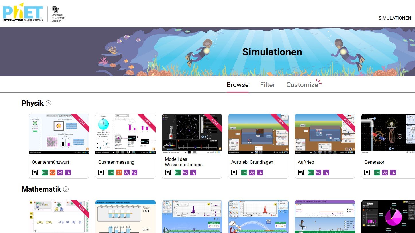 Während die Beschriftungen innerhalb der Simulationen auf Englisch gehalten sind, existieren für zahlreiche Themen deutsche Titel und Schlagworte, so dass die Sammlung auch mit Hilfe eines deutschen Filters durchsucht werden kann. Die Funktionsweise der Simulationen selbst ist in der Regel spielerisch erfahrbar und erschliesst sich mit wenig Hilfe aus den Symbolen, Illustrationen und weiteren grafischen Hinweisen.