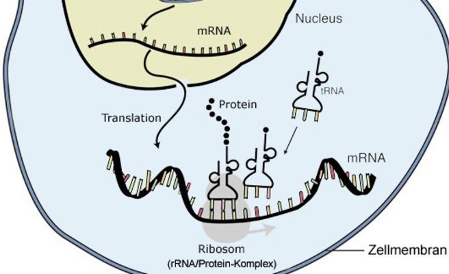 Um nach Anleitung eines DNA-Abschnitts ein Protein zu bauen, wird zuerst eine mRNA-Abschrift hergestellt. Anhand dieser werden Aminosäuren zu Ketten zusammengeknüpft.